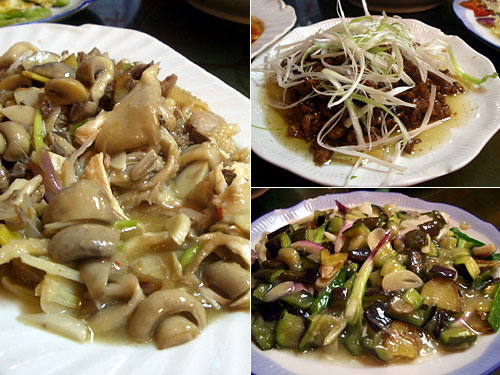 双茹焼鶏はマッシュルームと骨付きなので鶏のモモ肉かな?の炒め物で葱とにんにくが入った辛くない味。これだけが15元と2桁でやや高級なのは肉の量が多いからか?またとーってもジューシーで汁をご飯にかけても美味。京醤肉絲(ベイジャンロースー)は甘じょっぱい醤油味の片栗粉付き細切り肉の炒めに白髪葱。これ私のお気に入り。最後は茄子とピーマンの炒め。葱とにんにくと生姜たっぷりで旨い。