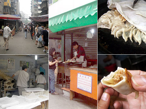 幸福家宴あたりから始まる小さな通りはおいしいもの屋さんが並んでいる。焼き餃子屋、果物をつけこんだ地酒屋(容器を持参すると入れてくれる)、水餃子入り麺屋、製麺屋、果物屋。この通りを歩いているだけで嬉しくなる。どの店も幅5m、奥行き2mくらいで商売していて昔ながらの商店街なのだろう。珍しく焼き餃子をやっている店があったので味見。4個で15円だ。肉厚の餃子の中には汁のしたたる肉餡が。外のかりっとした皮も旨い。