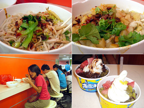じっくり見回って打ちたて麺が人気の店にした。奥でバンバンと麺を打つ音がしていて次々に平たいの、冷たいの、あったかいのと様々な麺。近くのカウンターは妙に高い。これは、器と口の位置を近くして洋服に汁が飛び跳ねないように配慮されているのか?町の中心部に戻り、洒落たパン屋で休憩。カキ氷に豆やフルーツを乗せアイスを絞り、最後に好みのフルーツソースをかけてくれる。昼食より高価だった。