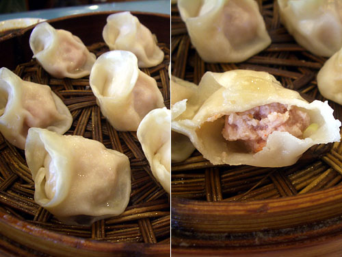 次にやってきたのは「蟹黄蒸餃」。豚ひき肉にカニ身を混ぜ込んだ餃子で、蟹の風味がたっぷりする餃子。昨日は水餃子で海老だと思って注文したのが「海老の頭だけ使った餃子」だった。海老の頭ってことは海老味噌だがどちらかというと殻の味が強く10個食べるのが大変だった。それに比べるとこちらは蟹の身なので食べやすい。10個で16元(240円)。