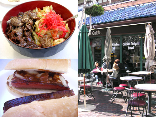 リトル東京にある、テイクアウトのお店は、外観もメニューも日本と米国のミックス。メニューの組み合わせはともかく、、加えて、パラソルと瓦屋根ってのはあまりないのでは?