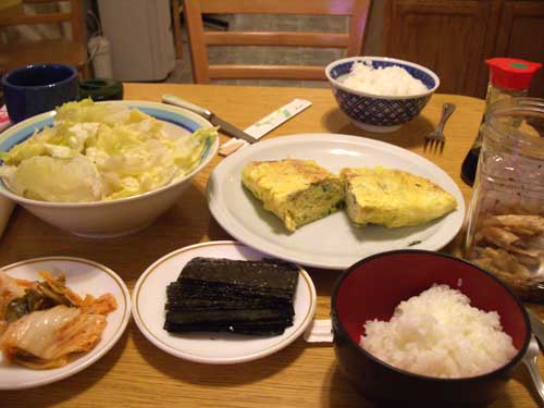 献立:卵焼き、レタス、味付け海苔、味付けザーサイ、ご飯