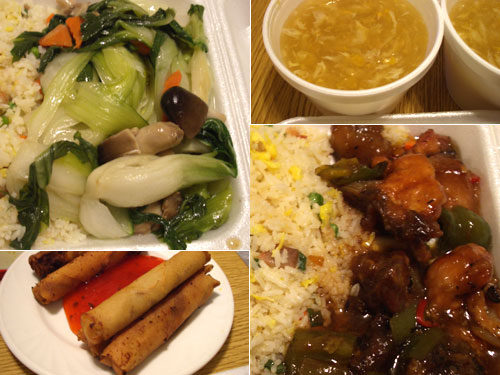 献立:野菜炒めと炒飯、肉魚あんかけと炒飯、スープ、春巻き
