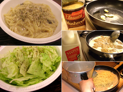 マッシュルームクリームスープを牛乳でのばして、茹でたスパゲッティーを入れてできあがり。¢99のスープ缶は半分使った。もう一回できますね。