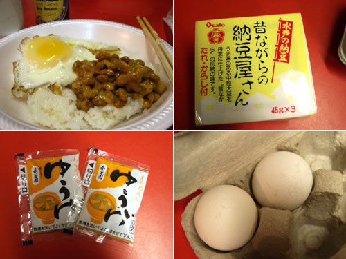 献立:納豆、目玉焼き、味噌汁、キムチ、ご飯