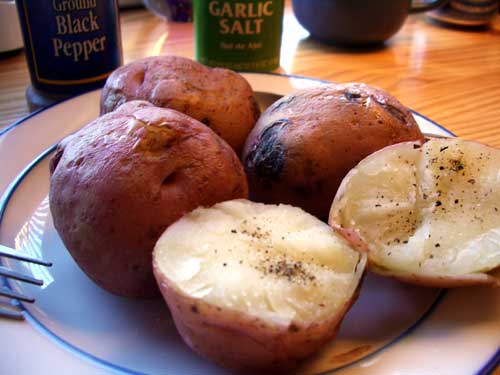 アメリカ製の電子レンジには、Baked Potatoというボタンがある。ボタンを押して個数の数字ボタンを押すらしい。小さめ4個だったので2つ分として勘定した。8分後、水分が飛んでシワシワになることなくふっくらと茹でじゃがいもができた。