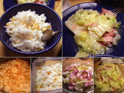 献立:えび炊き込みご飯、キャベツとベーコンの温野菜サラダ