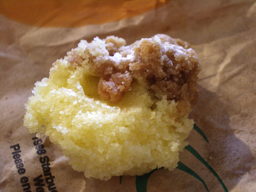 これ、上の部分がコーヒー味の砂糖の塊みたいになっていて、下はしっとりと重厚なスポンジ。スタバのケーキってまずいと思い込んでいたけど、コーヒーと一緒に食べたらおいしかった。二人で一つ食べたらお腹いっぱいになった。