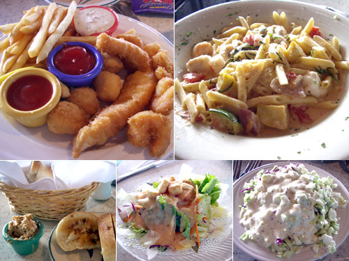 フリッターは、帆立とエビと白身魚の三種盛り。冷凍物ではあるが、そしてちょっと生臭いが、とってもジューシーだった。サイドメニューはコールスローサラダとフライドポテト。プリマベーラは相変わらず柔らかすぎる茹で具合のペンネに、塩味がないソース。魚介類はフレッシュでおいしいのになぁ。こちらもサラダ付き。最初に来たパンとオニオンとガーリック入りのバターは文句なしにおいしかった。