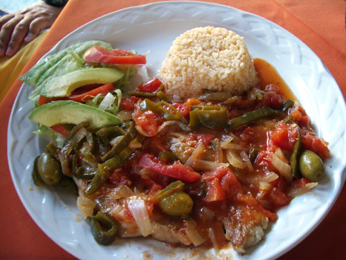 Pescado a la veracuruzanaは、魚のベラクルース風。海岸に面したベラクルース州はメキシコの中でシーフードのメッカと言われているらしい。ベラクルースの名がついているならおいしいだろうと注文した。魚のソテーにトマト・チリ・緑オリーブ・オレガノ・玉ねぎ・にんにくのソースがかかったもの。チキンライスとアボガドとレタスのサラダ付。おいしい。ベラクルースに行ってみたくなった。 |