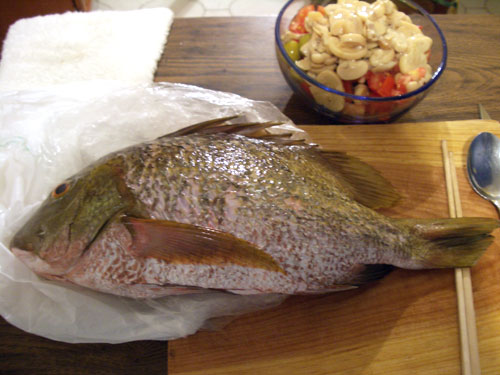 朝8時過ぎに、オープンマーケットでPargo Mulatoという魚を買う。辞書を見るとPargoは「タイの一種」とある。1キログラム40ペソの単価で、この魚925gあって37ペソ、つまり400円弱ということになる。うろこを取ってもらって持ち帰った。本当はぶつ切りにするか3枚におろすか聞かれたが、どうしても丸ごと調理したかったので、そのまま持ち帰った。でも、鍋に入らず、頭を落とさざるを得なかった。