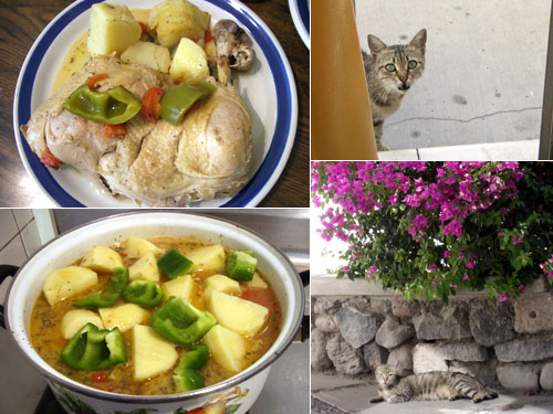「まだぁ?」と近所の猫も顔を出すけれど、まだまだ。猫君は木陰で待つことにしたようだ。1時間後、じゃがいもと緑のパプリカを入れて、更に1時間煮込んで出来上がり。