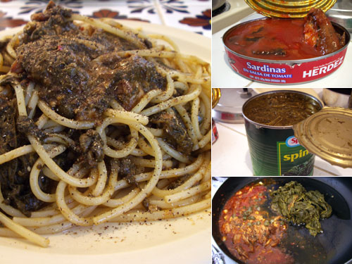 カボ・サンルーカスのアンチョビは、アメリカの3倍以上の価格。そこで、亜流プッタネスカを創作。トマトオイルサーディン、ケッパー(これが肝心)、ほうれん草の缶詰(生ほうれん草も高いので)、唐辛子、オリーブオイル、にんにく、茹で汁少々、塩・コショウで味付け。ほうれん草の缶詰はポパイの漫画で子供の頃見た物。まさか人生で自分が食べることになろうとは。近い。プッタネスカに近いものができた。