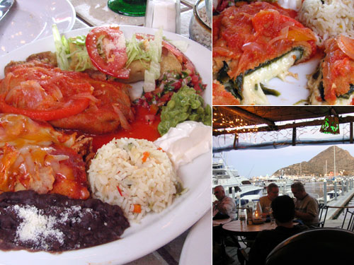 上から時計回りに、トルティーヤに鶏肉を巻いて揚げたもの、サルサ、ワカモーレ(アボガドのソース)、サワークリーム、ピラフ、小豆のフリホーレス、トルティーヤにチキンを挟んでトマトソースとチーズをかけたもの、チレ・レジャーノ(Chille Rellano)大きなチリにチーズを詰めて衣をつけて揚げたもの。チーズは乳臭が少しあるが癖は強くなく、チリのピリ辛さと良く合う。
