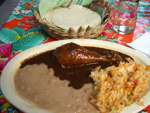 コミーダ・コリータは、メイン料理を選ぶと、トルティーヤや付け合せがついてくる形式の定食。店ごとに価格が異なり、付け合せもフリホーレス(豆の煮物)、チキンピラフ、サラダ、スープなどと様々。今回は、いんげん豆のフリホーレス、チキンピラフ、トルティーヤが付いてきた。写真はチキンのモーレソース。チョコレートの甘さは控えめでほろ苦さが強め。チキンは柔らかく、骨からの身離れがとてもよかった。