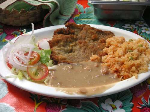 ミラネーゼも定番のメニュー。ミラノ風カツレツですね。薄く延ばした肉にパン粉などの衣をつけて揚げた物。ただし豚肉だったので、日本人の感覚としては「薄トンカツ」といったところ。塩・コショウ味はあるが、テーブルにおいてある、サルサ・ヴェルデ(緑色のサルサ)やサルサ・メヒカーノ(トマト・チリ・玉ねぎ・コリアンダー)をつけると、一層おいしかった。いんげんのフリホーレスは塩気なし。水で煮込んだ感じ。