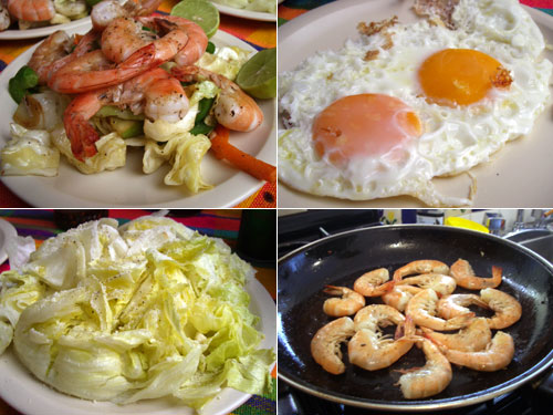 献立:エビと野菜の炒め、目玉焼き、レタスサラダ