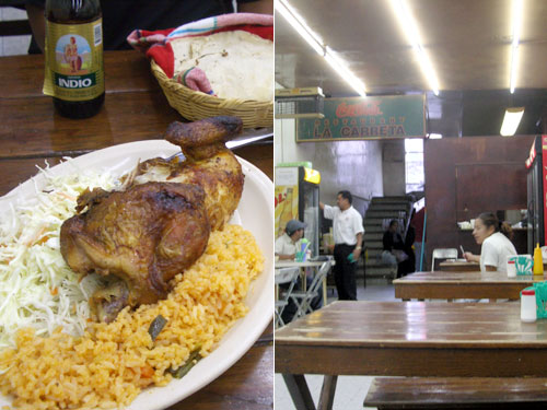 店頭でチキンをグルグル回してグリルしているのがたまらなくおいしそうで、入ってみた。しかし、午後7時半の店内に客はおらず、グルグルグリルもストップしていた。肉は温かかったが、やや油が落ちすぎで、皮が乾いてしまっていた。でも、付け合せのチキンライスもしっかりと味がついていて、おいしい。昼過ぎの焼きたてを狙って、来るべき。