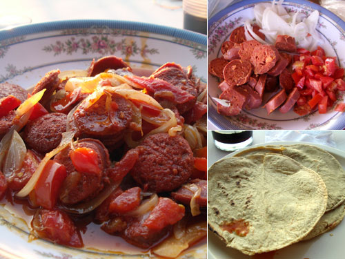 献立:チョリソーと玉ねぎとトマトの炒め物、トルティーヤ、ワイン