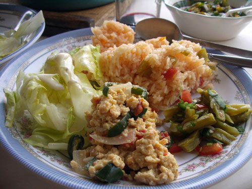 献立:チキンライス、メキシコ風いり卵、ウチワサボテンのマリネ、レタスサラダ、ワイン