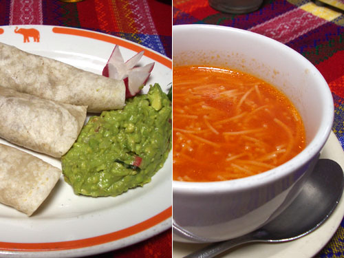 タコスは小麦粉入りタコスに牛肉(質が良かった)を巻いたものとワカモレとラディッシュがついてくる。テーブルにあるサルサメヒコをはさんで食す。普通においしい。スープは辛くないトマトスープ。麺は細いスパゲッティー。