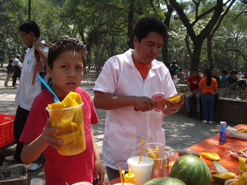 広いチャプルテペック公園には様々な屋台がある。おいしそうなフルーツ屋台ではお父さんがカットして息子が売る。日曜日のせいか、子供が手伝う姿が多く見られた。