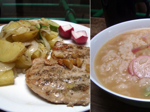 我が家では、豚肉のソテーの付け合せにはじゃがいもと玉ねぎのにんにく風味炒め、というのが定番だ。今日は、宿泊者共用戸棚に白ワインを発見。豚肉のソテーの仕上げに、フランベしたらフルーティーな香りに仕上がった。誰だかわからないが、ワインを置いていってくれた人に感謝。ご飯は昼間炊いたもので、レンジがないので味噌汁に入れてしまった。
