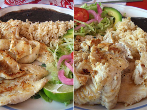イスラ・ムヘーレスにあるこのレストランは4件の定食屋が並んでいる。一番手前の店で食べた。どちらのメニューも見た目は全く同じ、魚のソテーとサラダとチキンライスとフリホーレスにトルティーヤが付く。ベースは塩・コショウ・ココナッツミルク。一つはそのままソテー、一つはにんにく風味。魚の名前は聞いたが忘れた。えぼ鯛くらいの大きさの開きで臭みもない。自炊で使ってみたい魚だ。