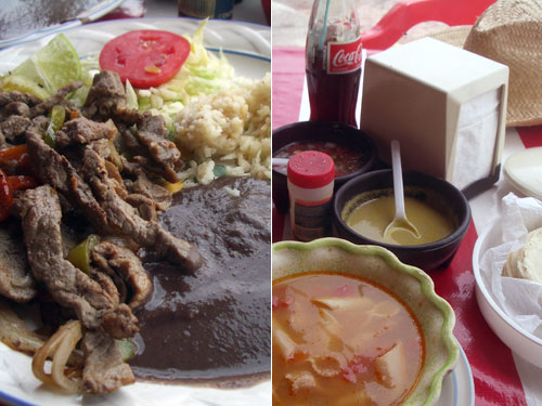 ここのコミーダ・コリータ(定食)は、スープ、メイン、トルティーヤ、ジュースが付いて一人N$40(約400円)。いい感じの値段だ。スープは鶏の足・首・内臓とパスタのトマトスープ。足や首は見た目がちょっとエグいが味はよかった。2人ともメインは、ファヒータ・デ・レス(牛のもも、パプリカ、玉ねぎの炒め物)。フリホーレスとサラダとチキンライスがついてくる。肉はちょっと硬いが、味はOK。全体のボリュームが結構あって、お腹いっぱい。