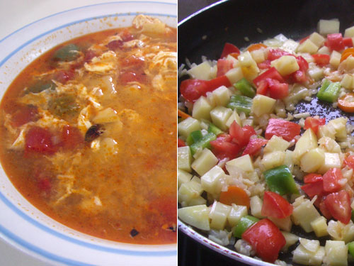にんにく1.5個、玉ねぎ、人参、緑パプリカ、じゃがいも、トマトを炒め、水、ブイヨン、パプリカ、オレガノ、コショウを加えて煮る。30分くらい煮込んだら、仕上げに溶き卵。