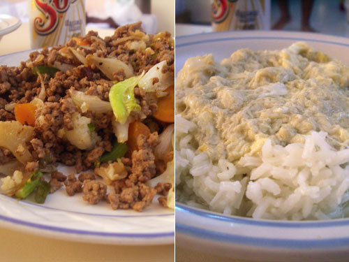 本当は中華丼のようなものが食べたかったが片栗粉がないので、創作。ブイヨンで人参・玉ねぎ・カリフラワーを煮た汁を卵でとじてご飯にかける。別に、牛のひき肉と緑パプリカを炒め、茹でた野菜を加えて、醤油・塩で味をつける。卵スープかけご飯に、炒め物を乗せながら食べた。これなら長粒米の臭いもあまり気にならずに食べられる。