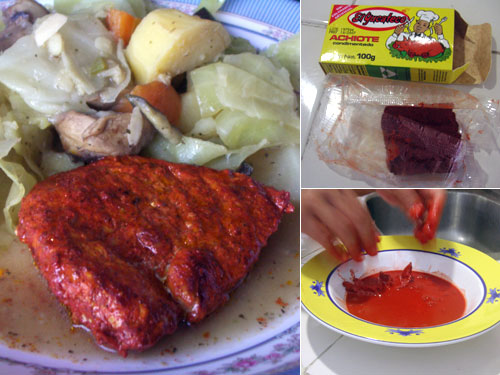 ユカタン半島の地元調味料にアチョテACHIOTEというのがある。ベニノキの実をペースト状にしたもので、これと酢と唐辛子で豚肉を煮た料理がコチニータ・ピビルCochinita Pibilという郷土料理。スーパーでは、アチョテと酢とにんにくと唐辛子を混ぜた固形状のルーが買える。水溶きして肉を数時間漬け込み、フライパンで焼いた。ほんのり辛くてほんのり酸味。肉の臭みも消える。