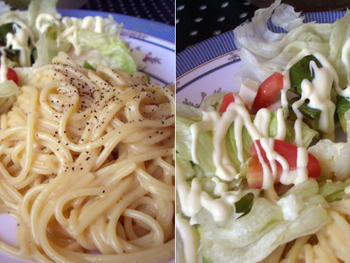 献立:カルボナーラ、サラダ、ビール