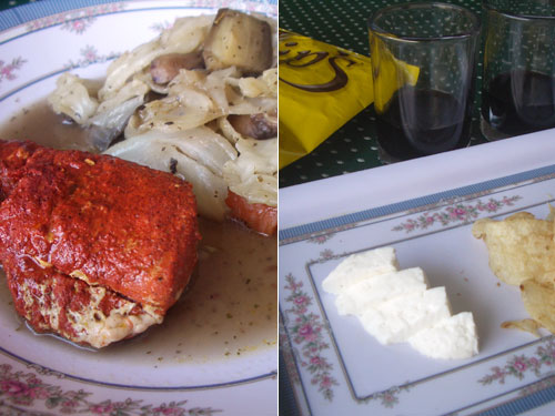 献立:豚肉のアチョテ漬け込みソテー、野菜のブイヨン煮、ワイン、チーズ、ポテトチップス