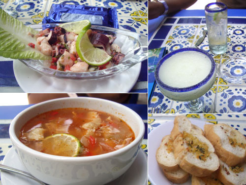 献立:セビッチェ、スープ、魚とエビのグリル、エビとステーキ、コーヒー、マルガリータ、発泡水
