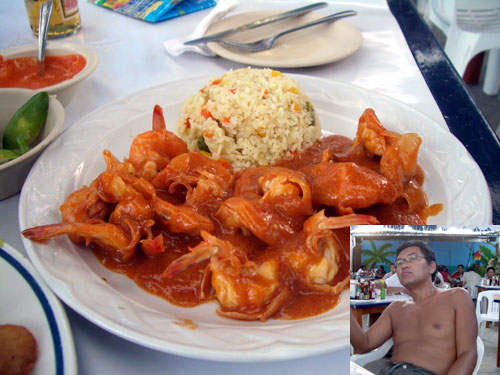 エビチリです、これは。エビとトマトと唐辛子が入っていて、少しピリッとするが、全ての味がとがっていなくて、マイルドでクリーミーな仕上がり。材料から考えても、エビチリだよねぇ?ソースは付け合せのピラフに絡めてもおいしい。とにかくソースの最後の一滴までなめたくなるおいしさだった。夫は、あまりのおいしさに食後に目がうつろになり、恍惚の人になってしまった。