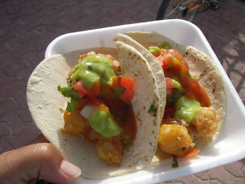 今日はシュノーケリングで昼食時間が遅れる予定。お腹がすかないようにと、コスメル島に行く前に、プラヤ・デル・カルメンのフェリー乗り場近くの屋台で、2度目の朝食。この辺りは午前中だけ屋台群が出る。地元の人でいつもいっぱいだ。先日、コチニータ・ピビルのサンドイッチを食べたのもここ。今日はエビと魚のフリッターのタコスを出しているシーフード屋台。ぷりっぷりの甘いエビがおいしい。