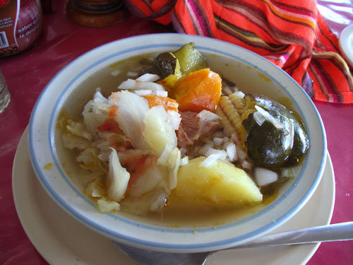 カルド・デ・〜(Caldo de 〜)は〜の煮込みスープのこと。レス(Res)は腿のことだが大抵牛肉。カルド・デ・レスは牛もも肉のスープ。4cm角の牛肉が4つと、人参、じゃがいも、ローカルズッキーニ、とうもろこしが入っていた。玉ねぎのみじん切りとライムと唐辛子の輪切りを入れて食べる。トルティーヤ付き。ローカルズッキーニは日本のかぼちゃのとっても水っぽいもの。冬瓜に近いかも。市場の食堂はおいしい。