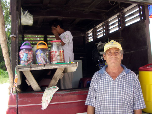 バスに置いていかれたので、ベリーズ側の国境で次のバスまで待つ間に、出ていた屋台で昼食。車内にキッチンを構えた移動屋台。おやじさんから、「日本の皆さんに是非この味を伝えてくれ」とメッセージを預かってきた。お母さんは恥ずかしくって顔を隠してしまったが。しっかし、ベリーズの国境の移動式屋台を勧めたところで、いったい誰が行けるというのか?