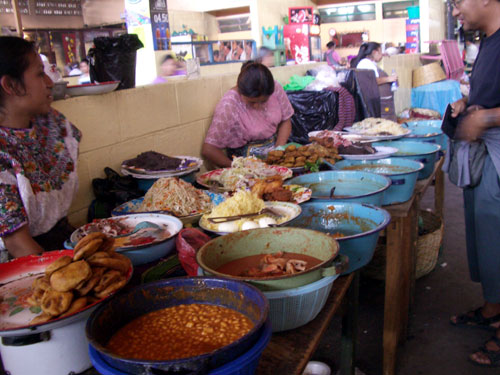 市場内にはこうしたテイクアウトの店がいくつかある。この店は多くの人が訪れていた。目の前にベンチがあったので、座って食べていたら、おばちゃんがライムの食べかすを投げつけてきた。「何が文句なのか?」と尋ねたら、自分のレストランのベンチに座って食べるなということらしい。いやぁ、グアテマラ人の洗礼を受けた昼飯だった。しかし、言葉でいってほしいと思うのだが。