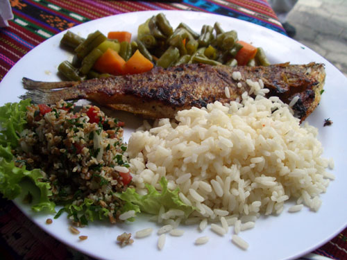 魚はブラックバスだと言われた。目の前の湖から獲れたと信じて食べる。これがおいしかった。魚もおいしかったが、私としては、付け合せのソースが気に入った。唐辛子とコリアンダーとトマトと玉ねぎ、ここまではメキシコのサルサと似ているし今まで自炊でも試してきた。今回は、ここに香ばしい味の茶色い薄皮の付いた米が入っていたのだ。これにより辛さがマイルドになり、香ばしさが魚を引き立てグッドだった。