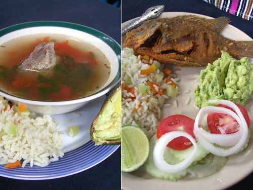 カルド・デ・レスは牛肉とトマトとコリアンダーがあるだけで、他の野菜はなし。ピラフとアボガドがついてくるので、スープに入れて食べた。味はまぁまぁだが、具が少ないのでちょっと不満足。魚はピラニアと同系のテラピアという淡水魚。身は柔らかく美味。じっくり揚げてあるので、頭からバリバリと食べてしまった。ただ背骨はさすがに硬いので残したが。見ていた犬も諦めてどこかに行くほどの食べっぷりだった。
