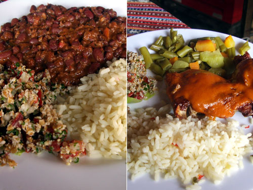 お気に入りのレストランで定食。チリビーンをピーマンの肉詰めと勘違いして注文した私。ロスでチリビーンだらけの毎日にうんざりして以来、チリビーンは苦手なことを忘れていた。うーむ、きつい。夫のチキンには甘酸っぱいトマトソース。バルバコアソースといって、グアテマラでは他でも目にした定番らしい。知っている味では、酢豚に一番近い。甘いソースがあまり好きではないが、まずまずおいしいと思う。
