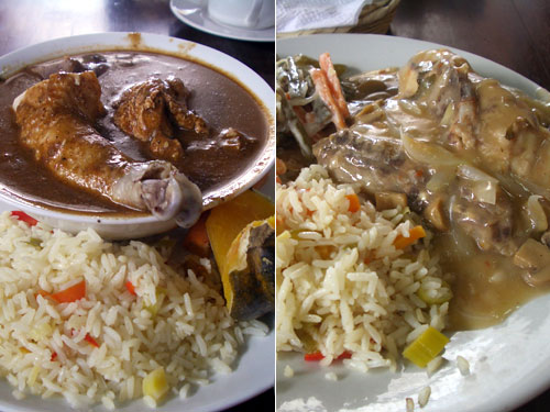 グアテマラ名物のペピアンに初挑戦。写真左のカレーのような色のシチューがそれである。味は、酸っぱい、辛い、ちょっとえぐみがある、不思議な味。メキシコのモーレソースから甘みをマイナスして、もっと薄い味にした感じ。この濃厚な見た目とは違って、あっさりとした味なのが不思議。今回は3種の肉入りということで、鶏の足、豚肉、牛肉が入っていた。これに茹でた人参と南瓜とピラフがついてきた。