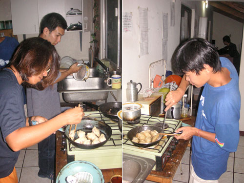 彼は、この乱入者にも「焼き方のコツを教えてください」と、とても腰が低く、なんと殊勝な人だと感動。更に、餃子も振舞ってくれた。私のは、皮が均等に伸ばせていないので、ところどころ分厚い皮が口に残る。師匠の餃子の方がおいしかった。計42個の餃子作り、お疲れ様でした。ご馳走様。