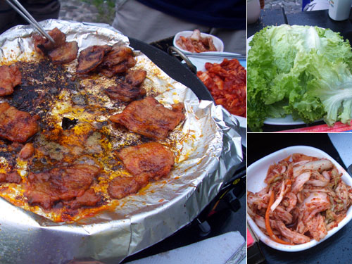 献立:焼肉、サンチュ、キムチ、ご飯、ビール