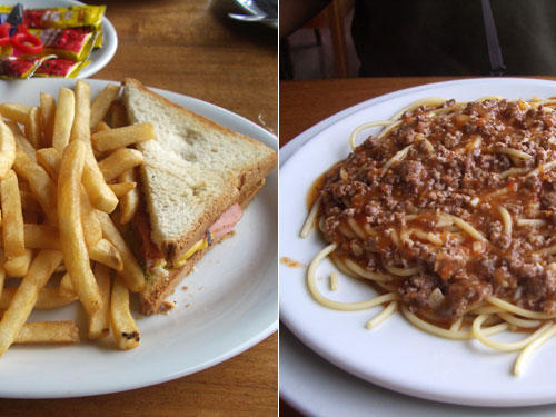 献立:スパゲッティーボロネーゼ、ハムチーズサンドイッチ、コーヒー、レモネード