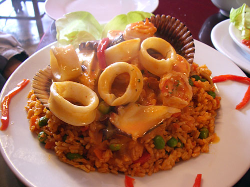 Arroz con Mariscos「海の幸入り米」というメニューは、トマト味でグリーンピース・コーン入りのしっとりピラフの上にとろみをつけた海の幸ソースが山盛り。ピラフは米が少し固めで温度も温くてちょっと残念だったが、上の海の幸がすごい量。セビッチェと違って魚介に火が入っているが、ホタテは半生で甘みがったし、エビ・いか・タコも柔らかい。リマ初日にして出会ったペルー料理は大当たり。期待できそうな国だ。