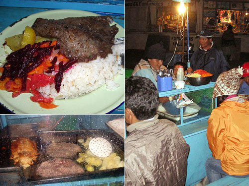夜7時半ともなると街の中央にあるアルマス広場の一角に屋台が開く。今日はミラネッサ(ミラネーゼ)セット。薄くたたいた牛肉に衣をつけて揚げたものに、フライドポテト、ご飯、野菜が付く。この店では、他にもマッシュポテト団子の中にミンチを詰めて揚げたものや、バナナにミンチを詰めて揚げたもの、あとはベヘレイというチチカカ湖特産の魚のフライ。とにかく衣をつけて何でも揚げるのが得意。周りはヒッピーか現地の人。たまに旅行者も。