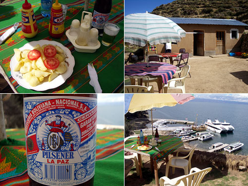 チチカカ湖に浮かぶ太陽の島の北港から南港までほぼ全島を徒歩3時間半で歩いた。南港の見える丘の中腹で遅めの昼食。このビールとフライドポテトのおいしかったこと。トレッキングという調味料を差し引いても、この景色、そして新鮮なじゃがいもを使ったフライドポテトは絶品だった。高地なのでカラッと揚がらない物ばかり食べていたのに、ここのはカラッとしている。一体どうやって作っているのだろうか?
